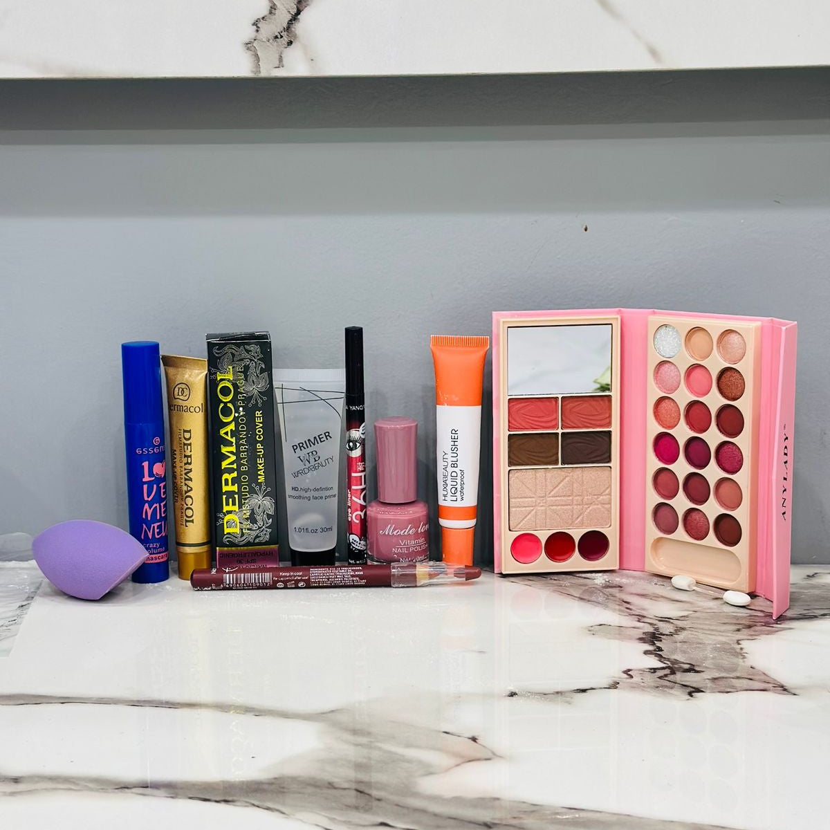 Elevate your everyday look with the Nude Glam Makeup Deal, a complete 9-piece set designed for natural, flawless beauty. This all-in-one kit includes a versatile Anylady eyeshadow palette with nude and shimmer tones, a soft nude nail paint, matching nude lip pencil, blendable liquid blush, volumizing mascara, long-lasting eyeliner, a soft beauty blender, skin-smoothing primer, and high-coverage Dermacol base. It’s perfect for creating soft daytime looks or full glam evening makeup with ease. Travel-friendly, beginner-friendly, and ideal for all skin tones, this kit delivers amazing value and performance. A perfect gift and a complete glam routine in one deal—grab yours before stock runs out!